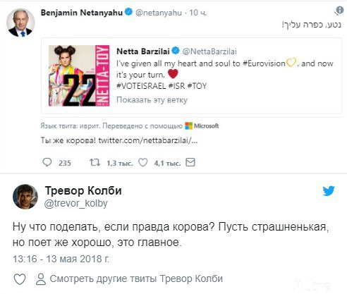 Израильский премьер Беньямин Нетаньяху обратился со своей страницы в твиттер к Нетте, написав трогательное поздравление. В нем он назвал исполнительницу "милая " на иврите, но автоматический переводчик на русский перевел некорректно и твиттер в его интерпретации начинается со слов "ты корова".