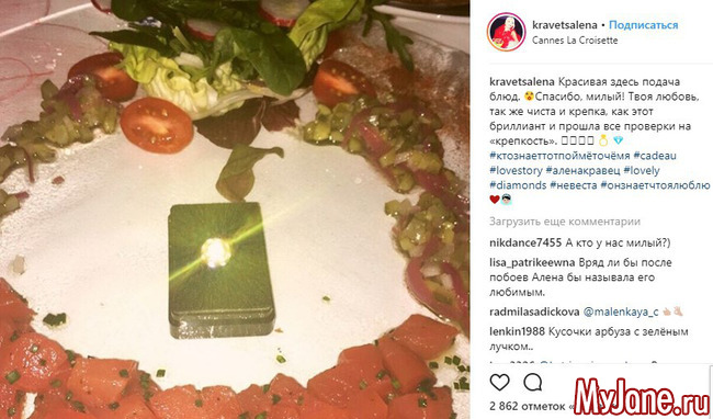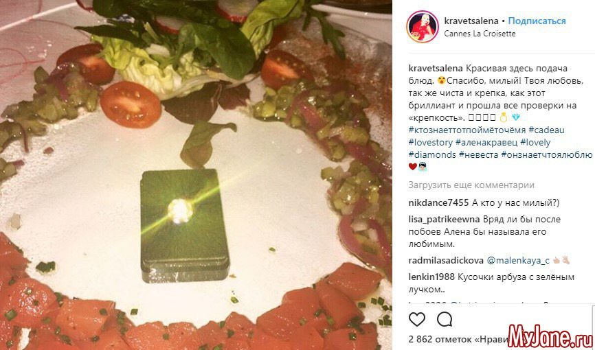 Всего пол года на центральных телеканалах муссировалась тема избиения Алены ее супругом и их развод. Но, милые бранятся, только тешатся. Миллионер преподнес своей бывшей жене бриллиант. Как стало известно не просто брильянт, а самоцвет оттенка шампань, размером в 6 карат. Стоимость такого очарования составляет от 16 млн. рублей. В инстаграме модели уже появились фото с бракосочетания.