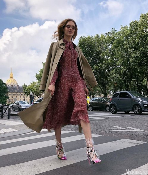 Так, дождливое парижское лето вынудло модель проявить смекалку. Красавица появилась на улице в стильных розово-черных туфлях на шпильке, завернутых в пакеты. А что? Зато сухо.