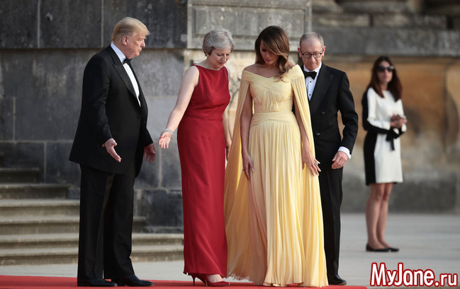 Первая леди США Мелания сопровождала мужа.Со стороны Великобритании их встречали премьер - министр Тереза Мэй и ее муж. На фоне лаконично одетой Терезы, Мелания в своем очаровательном платье напоминала принцессу из сказки Дисней. Элегантный и утонченный вкус первой леди США в очередной раз порадовал поклонников.