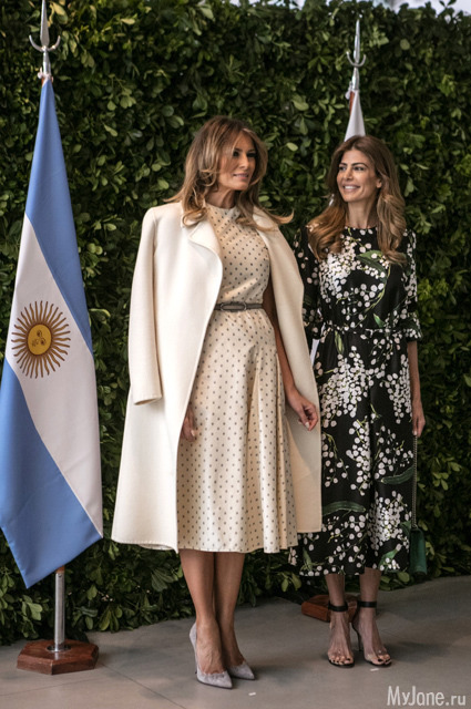 Для визита в городской музей искусств Мелания выбрала чудесное платье от Dior кремового цвета, а модных гороховый принт, тонкий ремешок и лодочки пастельного цвета дополнили образ. Но, надо сказать и жена президента Аргентины выглядела великолепно. Хулиана Авада выбрала для мероприятия темно-зеленое платье с цветочным принтом и изящные полупрозрачные босоножки. К слову, Хулиана является иконой стиля для аргентинских женщин и количеством модных нарядов не уступает Первой Леди США.