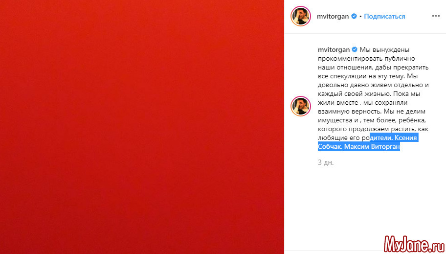 В минувшую пятницу, в своем личном инста - блоге Максим Виторган обратился к пользователям сети. Он сообщил, что их пара уже длительное время проживает раздельно. Но это не мешает им воспитывать общего ребенка, как любящим матери и отцу. Ни имущественных, ни "родительских" споров у супругов не возникает.