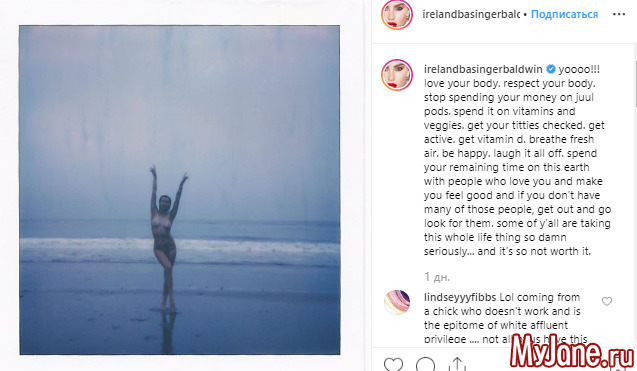 Дочь Алека Болдуина и Ким Бесингер всегда вызывала массу споров. Часть публики считало, что девушка не подходит для модельного бизнеса. Черты лица простоваты, фигура полновата. Айрленд призналась, что она испытывала страдания от травли и даже ненавидела собственную внешность. На днях девушка разместила в личном инстаграме фото топлес. Под ним модель оставила следующий комментарий: "Любите свое тело. Уважайте свое тело. Перестаньте тратить деньги на электронные сигареты, потратьте их на витамины и овощи. Сделайте чек-ап груди, будьте активны, получайте витамин D, дышите свежим воздухом, будьте счастливы, смейтесь." Поклонники девушки решили, что это очень позитивный взгляд на вещи и порадовались за Айрленд. Возможно, она смогла принять саму себя.