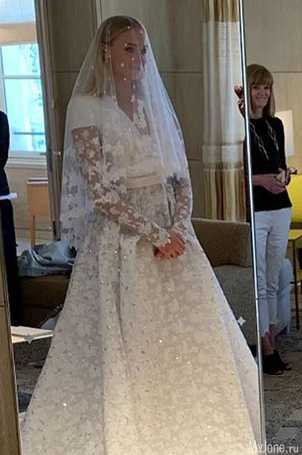 Так как Тернер является одним из представителей бренда Louis Vuitton, над ее образом работал креативный директор модного дома Николя Гексьер. Длинное классическое платье с вырезом на спине стало настоящим шедевром. Над вышивкой работали 10 вышивальщиц, они использовали 14 метров тончайшего тюля и тысячи страз и бусин. Работа над свадебным нарядом заняла больше 1000 часов. Актриса выглядела, как настоящая принцесса из сказки!