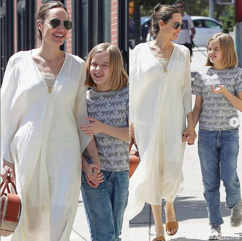 Легкая шелковая сорочка цвета слоновой кости выглядела великолепно. Несмотря на ранний час звезда сделала легкий макияж и надела украшения. Поклонников восхитили случайные снимки. Но, правда, некоторых фолловеров смутил истощенный вид Анджелины. В Париж звезда прилетела вместе со своей дочерью Вивьен, накануне папарацци засняли их на выходе из отеля.