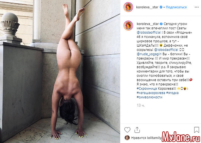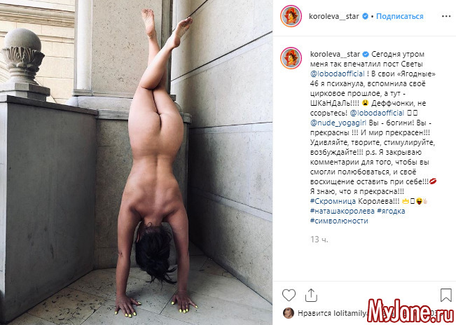 Наташа порадовала фолловеров фотографией, на которой она полностью обнажена. Стойку на голове звезда сделала не просто так. Ранее Светлана Лобода разместила в своем блоге фото известного тренера по йоге. Так как пост был размещен без отсылки на первоисточник, поклонники певицы решили, что на фото запечатлена Лобода, что рассердило девушку йога. Королева призвала двух дам примириться и повторила йогическую стойку. Кстати, звезда закрыла комментарии к публикации, она и так уверенна в собственной неотразимости.