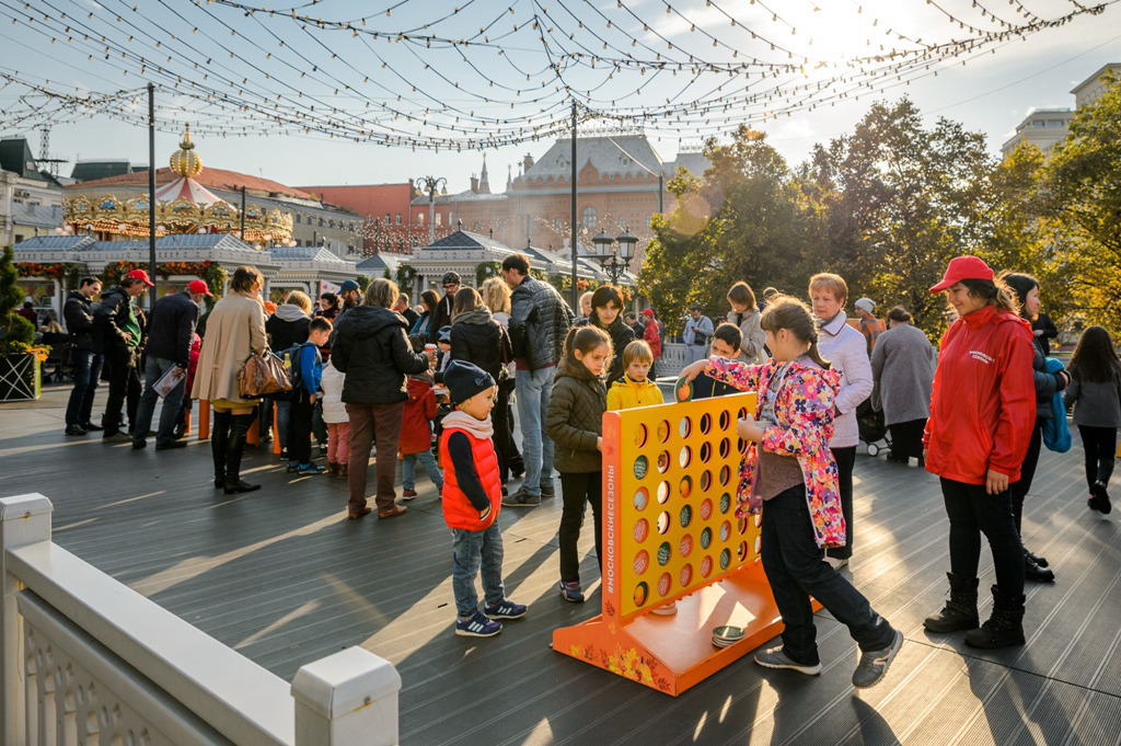 На площади Революции откроется уютный осенний городок. В узорчатых домиках – торговых и ресторанных шале – вы сможете приобрести «вкусные» сувениры – дары урожая со всех уголков России, и выбрать оригинальные блюда из специального меню, которое подготовили московские рестораторы. Со сцены площадки будет литься этническая музыка в современной обработке, а неподалеку появится живописная трасса, где устроят гонки радиоуправляемых тракторов!