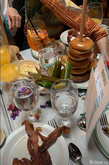 Сначала красотка прогуливалась в черном пиджаке, мини- юбке и гольфах. В таком виде модель отправилась на обед со своими родственниками в уютное нью - йоркское кафе Sadelle’s. Судя по личному инстаграму Беллы - в свой день рождения про диеты она забыла. Ведь на столе были и бекон и гамбургер. А вечером на вечеринку в клубе Miss Lily супермодель пришла в ярком платье с необычным геометрическим рисунком. С днем рождения девушку поздравили все известные коллеги по модельному бизнесу, но самым трогательным стало поздравление от старшей сестры Джиджи. Она опубликовала в своем блоге детский снимок, который вызвал умиление фолловеров.