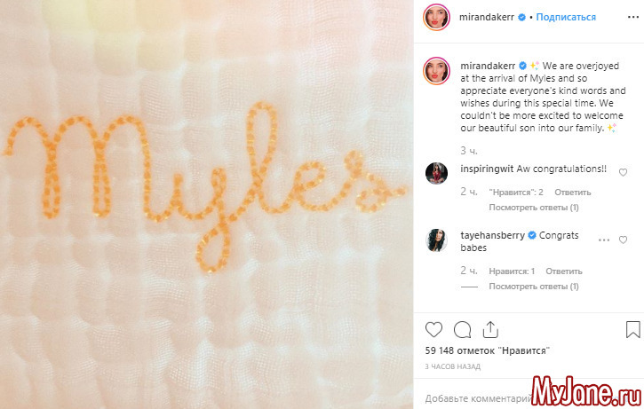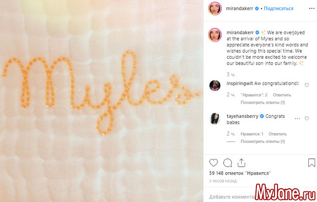 Подробностей заполучить не удалось. И вот все раскрылось! Информацию удалось получить из первоисточника. Пара сделала совместное заявление: "Мы очень рады рождению Майлза и благодарны всем за добрые слова и пожелания в наш адрес в это особенное время". Миранда стала мамой в третий раз. Старший сын, восьмилетний Флинн, был рожден от актера Орландо Блума.