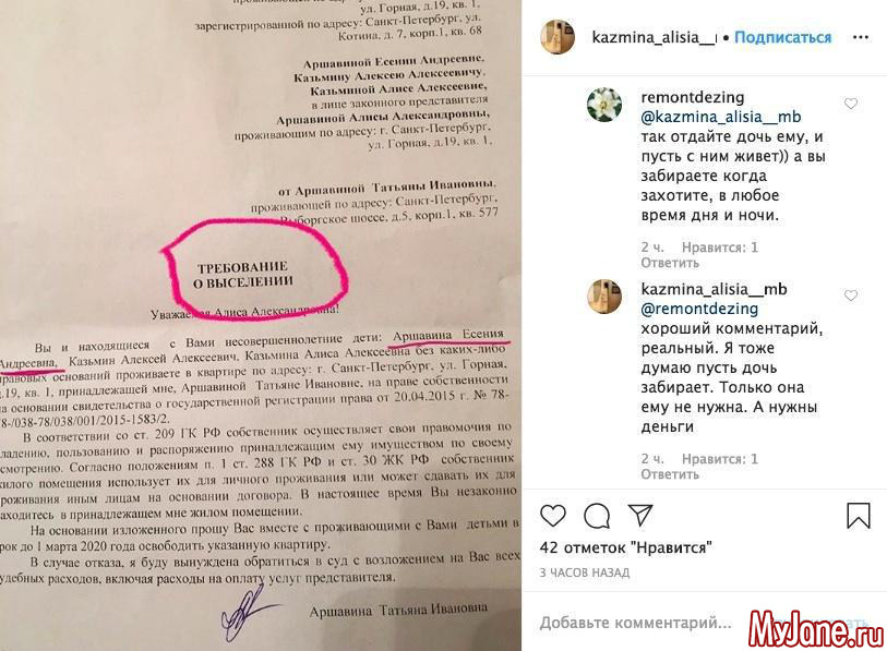 Вернее, бывшую супругу Алису Казьмину и совместную дочь Есению. Алиса получила требование, в котором указаны сроки освобождения жилья - 1 марта.