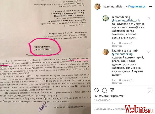 По документам апартаменты в городе Санкт - Петербург принадлежат матери Андрей Аршавина. Поэтому и требование составлено от имени Татьяны Ивановны Аршавиной. Фактически маленькая Есения, которую папа так и не прописал в квартире, оказалась в очень странном положении. Подписчики Клязьминой разделились на два лагеря. Одни сопереживают Алисе и желают ей скорейшего решения жилищных вопросов. А другие рассуждают в таком ключе: "Ты же одобряла, когда он вышвырнул Барановскую? Мужчины не меняются."