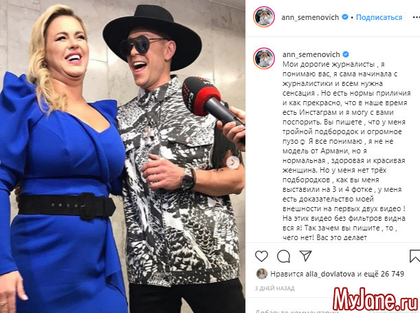 На этот раз Лена плотно "прошлась" по внешности певицы Анны Семенович. Певица выставила в свой инста - блоге неудачный снимок, на котором виден второй подбородок и выпирающий живот, отметив, что это всего лишь ракурс и на видео видно какая она без ретуши. Миро отреагировала почти сразу же. «Может, когда она стоит прямо, у нее видны не три подбородка, а два — и увесистый зоб. Теперь она бескомпромиссно толстая и некрасивая. Но по-прежнему цепляется за былую привлекательность», - написала в своем ЖЖ блоггерша.
