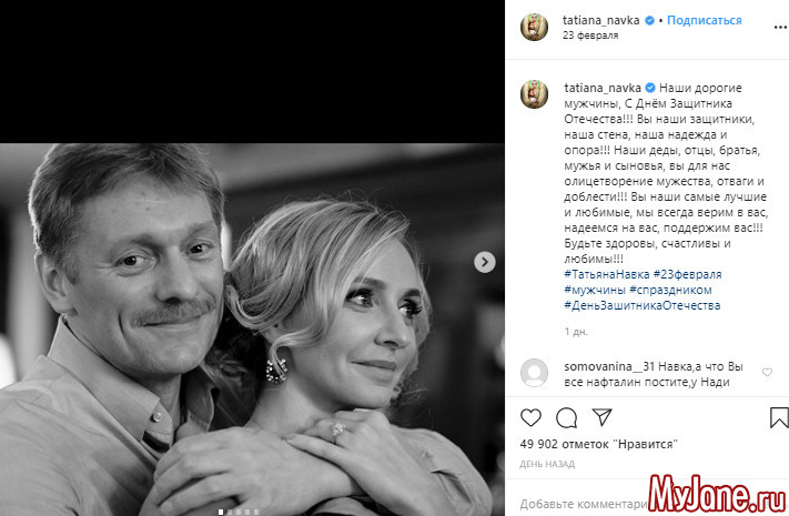 Татьяна замужем за пресс - секретарем Президента РФ. Дмитрий Песков личность публичная, но на политической арене. Тем не менее в день празднования 23 февраля, Татьяна опубликовала нежное фото с супругом и обратилась к своим подписчикам, поздравив их с знаменательным днем. Фолловеры Навки сочли снимок очень трогательным, отразившим суть "защиты" мужчиной своей женщины.