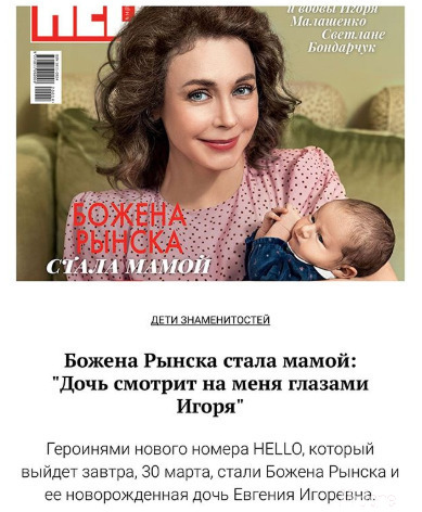 В своем личном инстграм аккаунте Божена разместила фотографию обложки нового мартовского выпуска еженедельника Hello, на которой она изображена со своей дочерью. Отцом ребенка стал покойный супруг Божены, бизнесмен Игорь Малашенко, а выносила малышку суррогатная мать. Одной из первых журналистку поздравила певица Лолита Милявская.