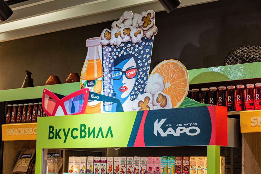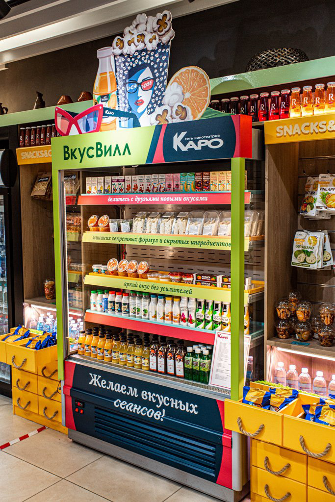 «КАРО» станет первой киносетью, где можно будет приобрести продукты «ВкусВилл». Проект стартует с 30 сентября 2020 года, а уже в октябре новые позиции бренда здорового питания станут доступны в 9 кинобарах u-choose. В крупнейших мультиплексах «КАРО» (КАРО 11 Октябрь, КАРО Sky 17, КАРО Vegas 22, КАРО 13 Кунцево, КАРО 7 Атриум, КАРО 9 Каширский, КАРО 10 Реутов, КАРО 10 Щука и КАРО 7 Капитолий Вернадского) будут представлены 2 вида витрин с продуктами «ВкусВилл»: витрина с классическими снеками (50 позиций) и fresh-витрина с напитками, сэндвичами и десертами (70 позиций). Всего в кинотеатрах будет представлено более 100 наименований от «ВкусВилл», среди которых ягодно-фруктовые снэки, сухофрукты, сэндвичи, круассаны, морсы и многое другое. Присутствие в ассортименте товаров ВкусВилл увеличит долю продуктов здорового питания в кинобарах сети «КАРО» до с 3,8% до 20% по сравнению с ситуацией на октябрь 2019 года.