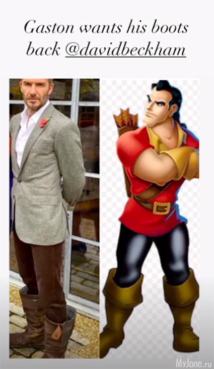 Надо сказать, что образы супруги выбрали необычные. Особенно поразил Дэвид, примерив сомнительного вида сапоги с необъятным голенищем. Такой необычный выбор обуви дал Виктории повод подшутить. В сторис своего блога она опубликовала коллаж из фото мужа и персонажа мультфильма "Красавица и чудовище". "Эй, Гастон хочет вернуть назад свои сапоги", - подписала публикацию Виктория.