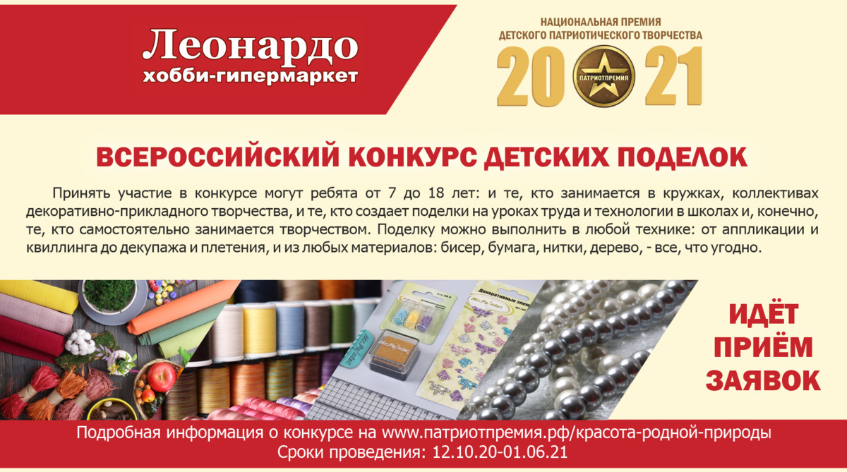 Национальная премия детского патриотического творчества и сеть хобби-гипермаркетов «Леонардо» приглашают к участию во всероссийском конкурсе детских поделок «Красота родной природы». Принять участие в конкурсе могут ребята от 7 до 18 лет: и те, кто занимается в кружках, коллективах декоративно-прикладного творчества, и те, кто создает поделки на уроках труда и технологии в школах и, конечно, те, кто самостоятельно занимается творчеством. Поделку можно выполнить в любой технике: от аппликации и квиллинга до декупажа и плетения, и из любых материалов: бисер, бумага, нитки, дерево, - все, что угодно. Заявки на участие в конкурсе и фотографии работ принимаются до 7 февраля 2021 года.