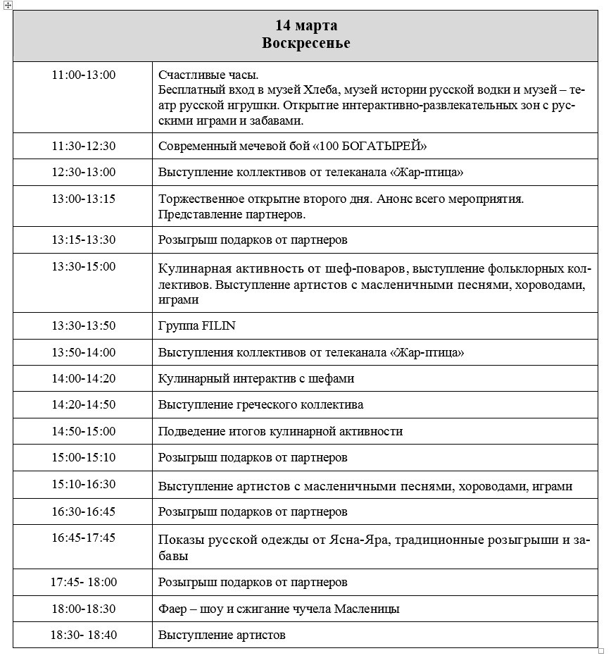 В течение двух дней вас ждёт насыщенная развлекательная программа, выступления музыкальных фольклорных коллективов, флешмобы, игры и забавы, розыгрыш призов от партнёров, сжигание чучела, выступление ходулистов и многое другое. Гости смогут по-кататься на исконно русских аттракционах, ледяных горках и послушать выступления артистов.