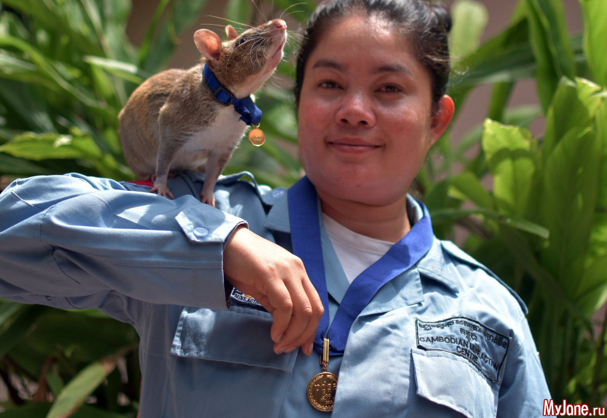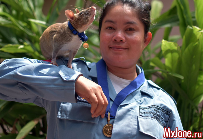 В общей сложности сапером в Камбодже эта африканская гигантская крыса прослужила целых пять лет, и вот теперь пришло время отправиться в отставку. А крысой-героем Магаву называют потому, что на протяжении всей своей весьма успешной карьеры она обнаружила семьдесят одну мину и тридцать восемь неразорвавшихся боеприпасов, оставшихся в стране со времен войны во Вьетнаме и последовавшей за нею гражданской войны! И это первое животное-сапер в мире (за исключением собак, разумеется), получившее почетную золотую медаль PDSA (по сути, это своеобразный «животный» аналог небезызвестного «Георгиевского креста»)! Африканские гигантские крысы примечательны тем, что они с легкостью поддаются дрессировке, а Магаву начали тренировать еще в юном возрасте – как только она обнаруживала взрывчатые вещества, она сразу же подавала специальный сигнал и замирала. И, даже несмотря на то, что эти крысы крупнее своих сородичей, они все равно достаточно легкие для того, чтобы пробежать по мине без каких-либо последствий. Кстати, Магава могла похвастаться еще и весьма впечатляющей скоростью работы – она без особого труда проверяла в течение получаса территорию размером с теннисный корт! Теперь же Магаве исполнилось семь лет, а это для ее вида уже преклонный возраст, так что, даже невзирая на то, что крыса вполне здорова, было решено отправить героиню на заслуженный отдых!