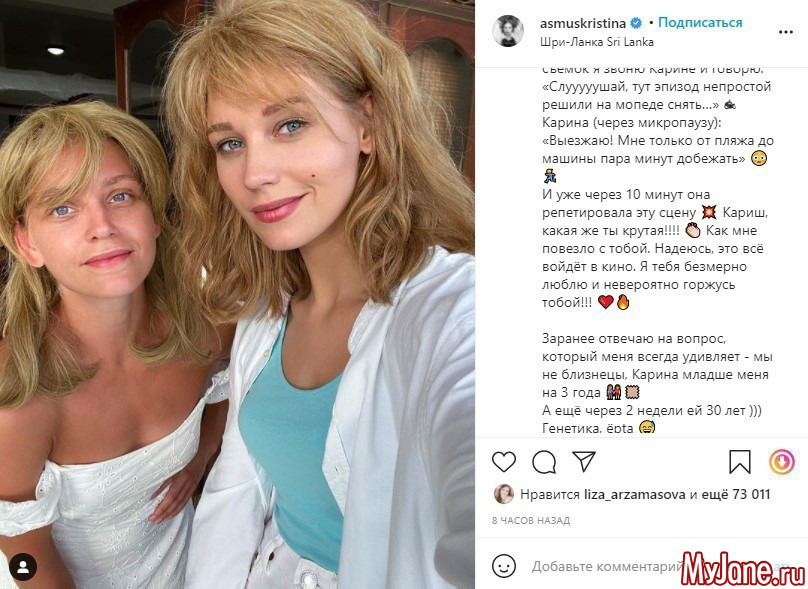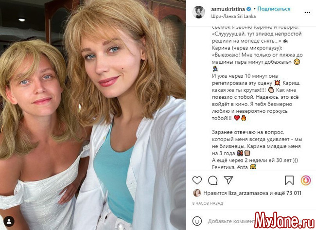 Кристина опубликовала в своем личном блоге новый пост, посвященный ее младшей сестре Карине – в нем она поблагодарила Карину за то, что та стала ее дублершей в снятой на Шри-Ланке сложной сцене!