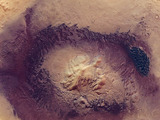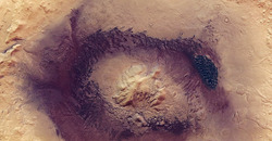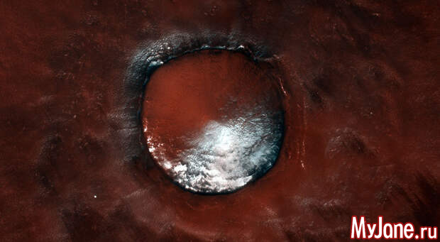 Именно так выглядит расположенный в районе Великой Северной равнины марсианский кратер шириной в четыре километра. А сделан данный снимок был орбитальным аппаратом ExoMars Trace Gas Orbiter. Живописный кратер частично заполнен водяным льдом, и особенно много этого льда на гораздо хуже освещаемых на протяжении всего года северных склонах. А идущая по краю кратера темная полоса образована вулканическими материалами, такими, как базальт. При этом большая часть данной местности, сформированной в результате обусловленных работой ветра и продолжающихся по сей день эоловых процессов, свободна ото льда. Если же внимательно посмотреть в правый нижний угол снимка, можно увидеть там причудливые полосы – это ветер удалил с поверхности яркую пыль оксида железа, обнажив своеобразную «подложку» более темных оттенков. И, между прочим, в недалеком будущем исследователи Марса обещают порадовать землян новыми эффектными снимками!