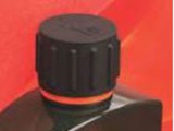 Флакон выполнен в зеленом металле и украшен оранжевым кольцом.
