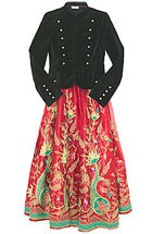 Богатые ткани – еще одна тенденция в рамках «русского стиля». Бархатный жакет с рядами металлически пуговиц Primark в сочетании с алой юбкой с золотым и зеленым узором в виде павлиньих перьев выглядит сногсшибательно.