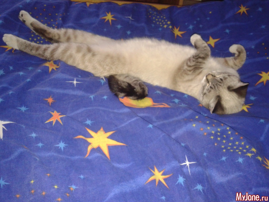Иногда прибежит минут пять полежит на кровати,и опять к своему дитю. В пятницу должны забрать котёнка,опять будет спать на месте.Наверно будет скучать.