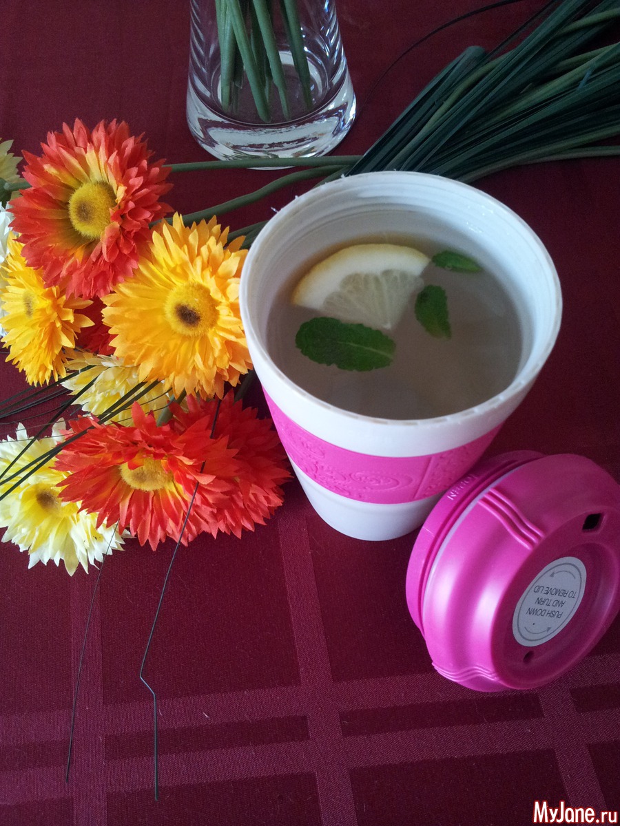 Просто в кипяток ломтик лимона и немного свежей мяты. Ароматно и аппетит немного отбивает.