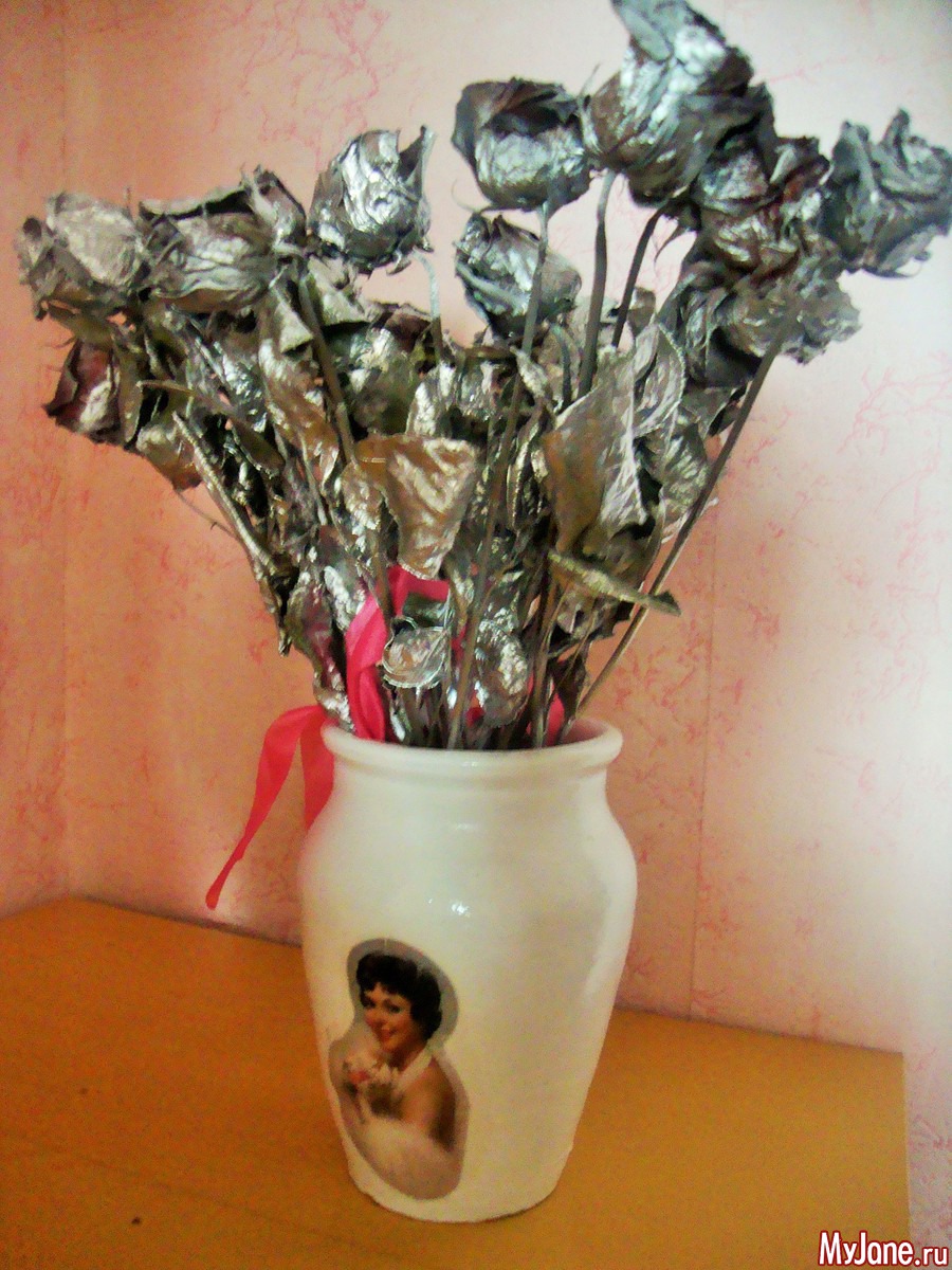 Засушенные розы хорошо смотрятся в старой крынке оформленной декупажем.