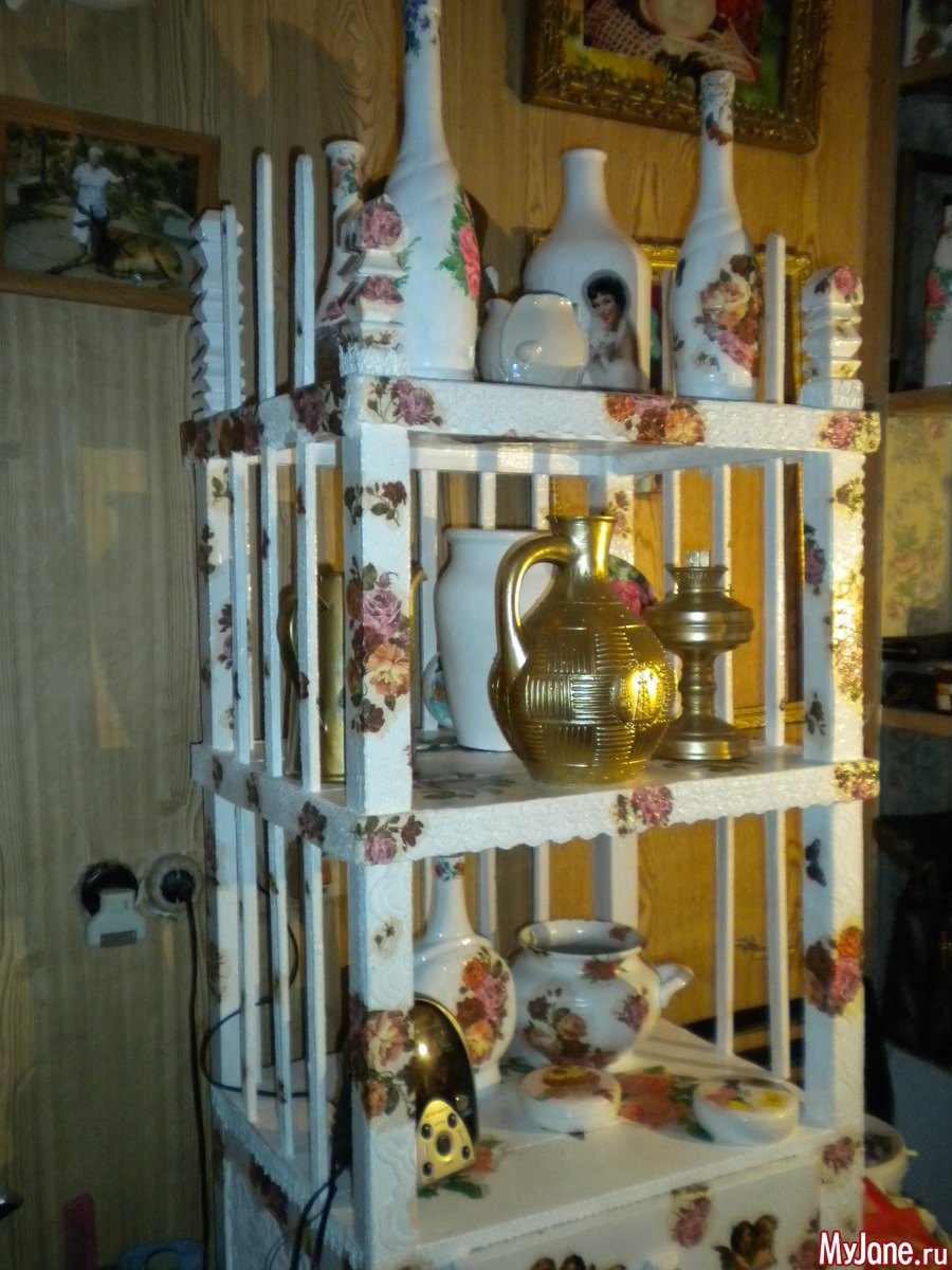 Шебби-шик (англ. shabby – поношенный, потертый) – название стиля .Название буквально можно перевести как “потёртый блеск” или “потёртый шик”, что и отражает его сущность. Это очень молодой стиль, рождённый в конце 80-х г. Вот так сделала этажерку и выставила свои поделки.