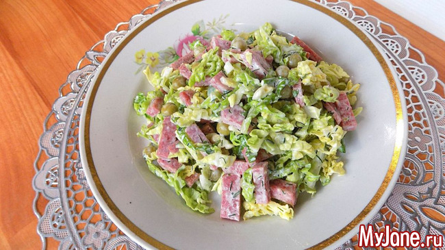5. Все хорошо перемешиваем и наш быстрый салатик из савойской капусты с колбасой готов. Приятного Вам аппетита.