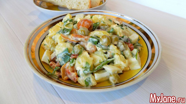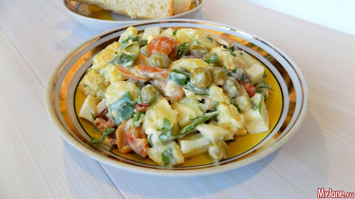 6. Солим наш салатик по своему вкусу и заправив майонезом хорошо его перемешиваем. Наш картофельный салатик с маринованными грибами готов, можно подавать его на стол.