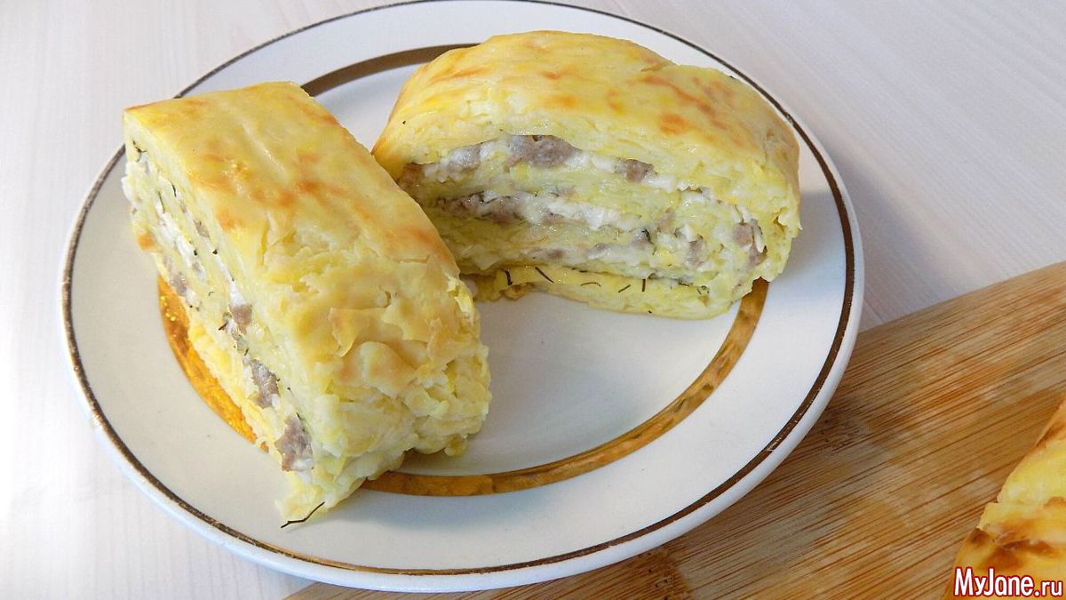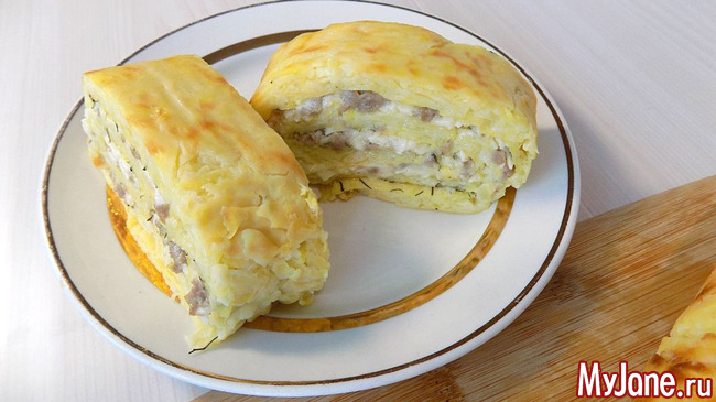 8. Даем кабачковому листу остыть, чтобы начинка из сыра хорошо на него намазалась. Выложим сырную начинку с фаршем и равномерно распределим его по всей поверхности, немного не доходя до одной из сторон.