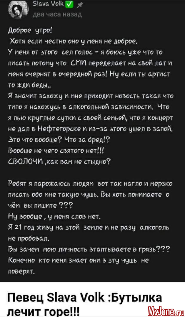 Slava Volk Певец - Вы сволочи, что вы творите? : Певец шокировал признанием обвинив его в употреблении алкоголя!!!