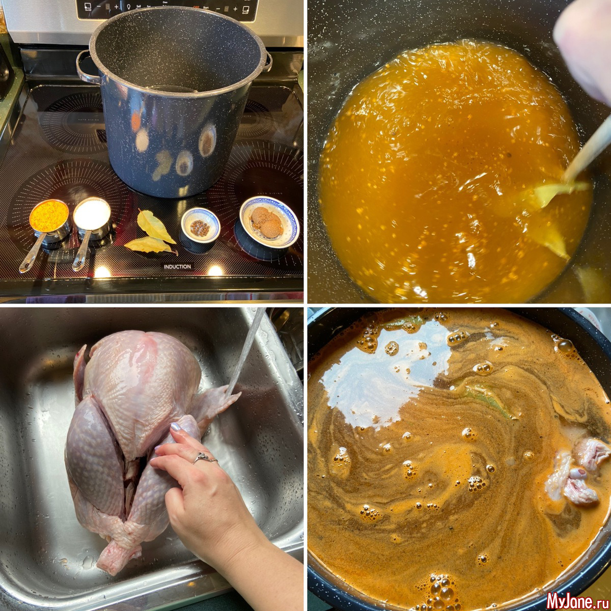 Сегодня день подготовки. Сначала рассол для птички. У меня самая маленькая что я нашла в магазине на 6,23 кг. В рассоле птичка должна пролежать от 24 до 48 часов. Цыпа должна быть полностью размороженная. Я обычно начинаю делать рассол с половины объёма - 4 л воды, 0,5 стакана seasoning соль (специфичная соль со специями), 0,5 стакана обычной соли, 1,5 ст.л. коричневого сахара, горсть чёрных перчинок, 2 лавровых листа. Хорошенько перемешать.