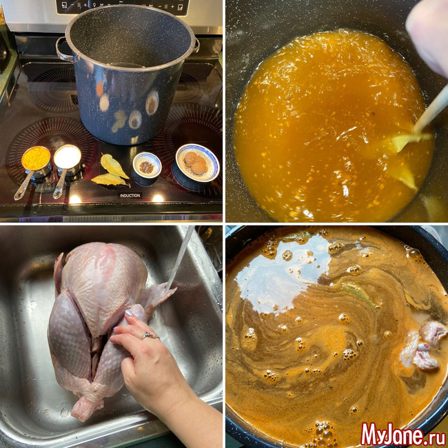 Птичку помыть. Чисто из опыта, индюшка всегда имеет пару недовыдернутых перьев и пух. Плюс обычно в тушку пихают шею и внутренности. Их надо вынять. Шею я в маринад не кладу потому что она потом получается слишком солёной. Добавила ещё 2,5 литра воды и рассол домешала на 2 литра (по половине выше приведённых специй). Ещё я немного поимпровизировала и добавила в маринад лимон просто потому что он у меня был и надо было использовать. Цыпу с маринадом в холодильник на завтра.