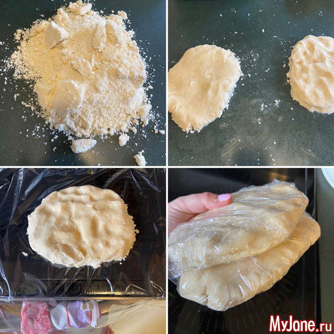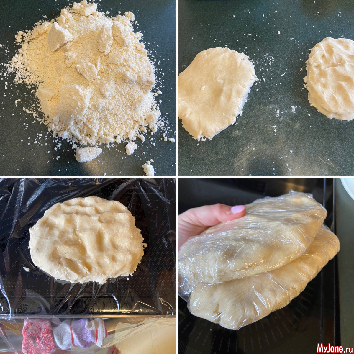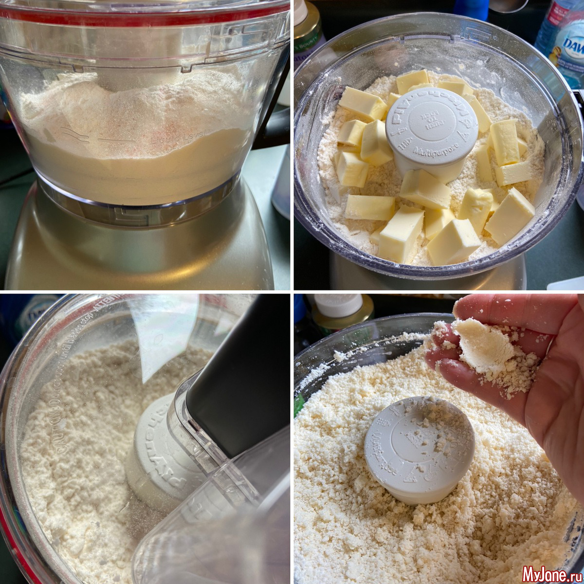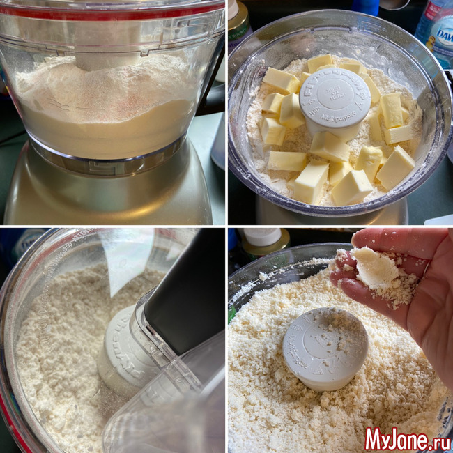 В кухонном комбайне пульсануть первые 3 ингредиента. Добавить масло и пульсовать пока не образуется крошка. Добавить 7 ложек воды. С водой надо быть осторожной ибо если добавить слишком много, то тесто будет слишком липким и будет трудно раскатывать. Пульсануть опять. Высыпать на поверхность и сформировать комок теста. Не месить! Вообще тесто на пироги лучше трогать поменьше. Поделить на 2 ровные части, сформировать диски, в плёнку и в холодильник как минимум на час. Я оставила на дольше так как мы ехали на ужин к свёкрам.