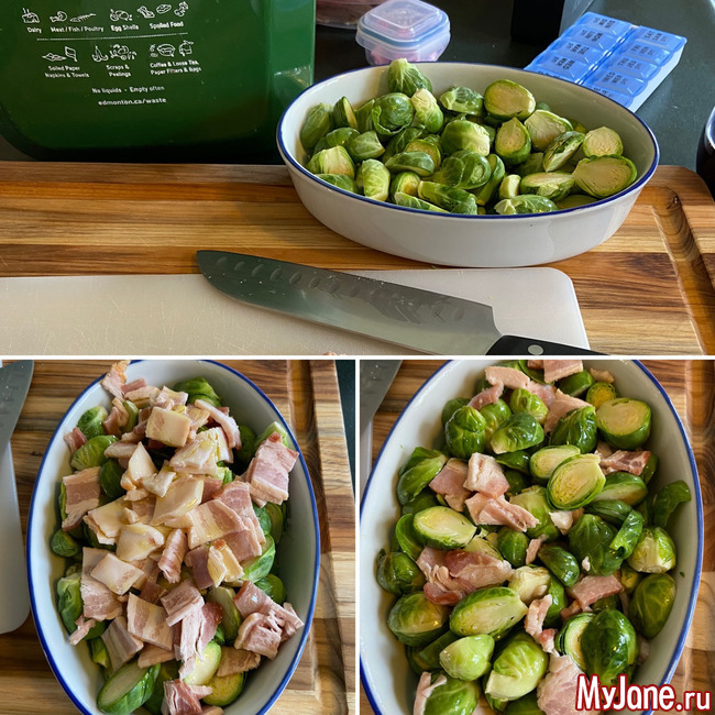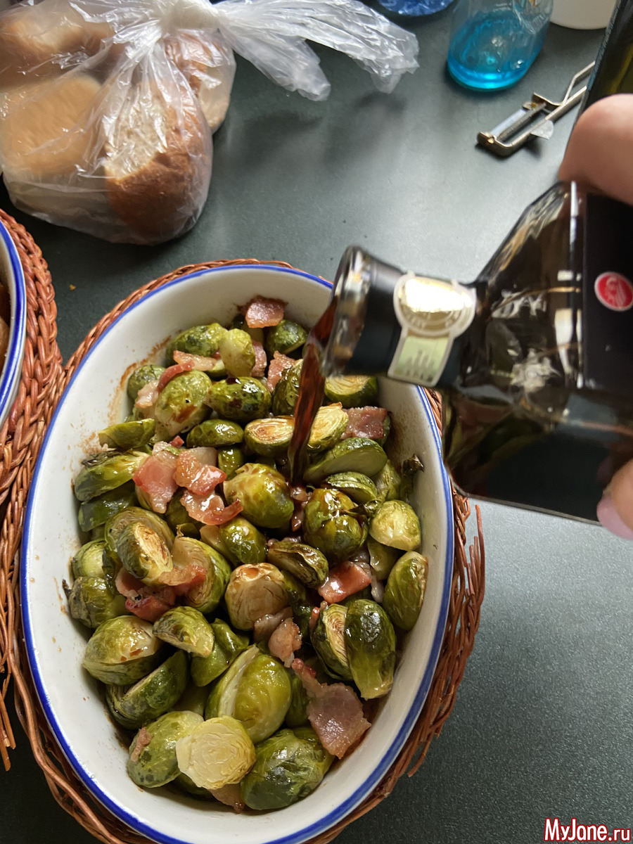 Брюссельская капуста изначально была по рецепту Ины Гартен, но я добавила кое-что и рецепт уже мой. Капусту порезать пополам, убрать жёлтые или сухие листики, посыпать солью, полить оливковым маслом. Нарезать сырые ломтики бекона на мелкие кусочки и в блюдо к капусте. Хорошо перемешать всё руками чтоб бекон был равномерно распределён и масло было размазано по капусте. Запекать в духовке 30-40 минут. Когда капуста готова, достать и сразу полить бальзамическим уксусом и перемешать.