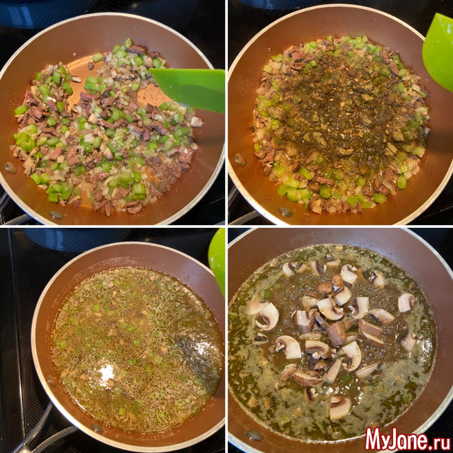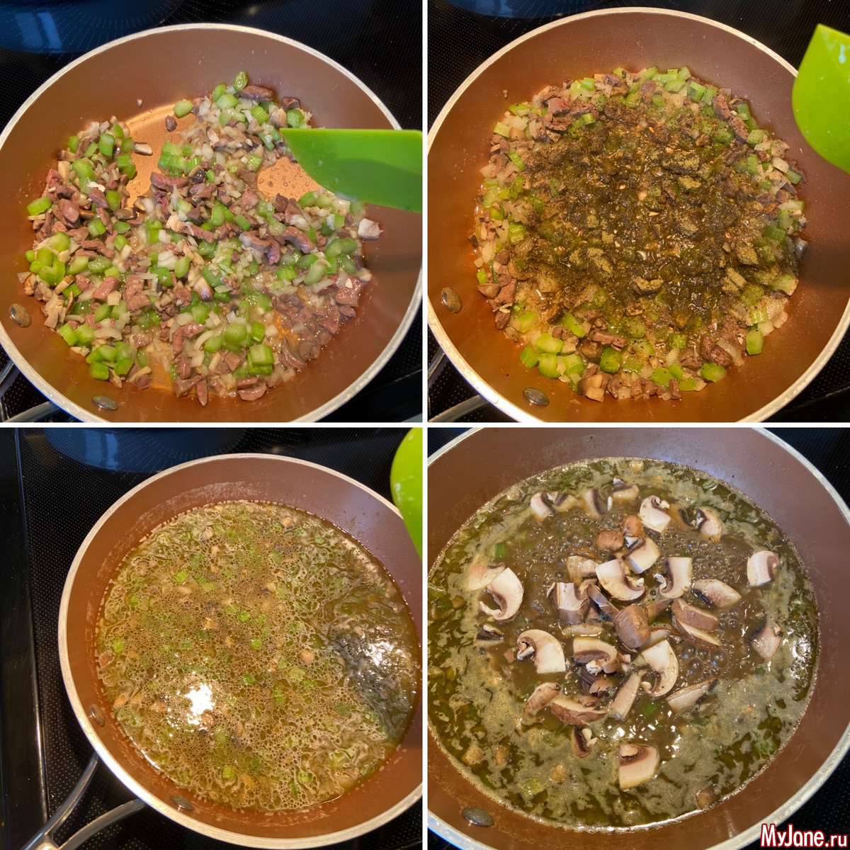 Стафинг изначально запекался в индюшке, но последние 15-20 лет народ перестал это делать ибо повышенный риск сальмонеллёза если стафинг не пропечётся. Поэтому сейчас его готовят отдельно. Берём хлеб. Нарезаем кубиками. В итоге я взяла 5-6 квадратных кусков. Сушим, в духовке при 150 градусах минут 10-15 хватит. Меленько нарезать внутренние органы цыпы (печень и сердце), обжарить в сливочном масле, масла побольше. Добавить мелко нарезанные лук и стебли сельдерея, нарезанные грибы (шампиньоны) очень мелко 3-4 стебля и 1-2 шляпки и 2-3 шляпки тонкими ломтиками, соль, перец и шалфей с savory (гугл перевод чабер садовый) обе специи я покупаю в порошке и просто посыпаю месиво. Примерно 0,5 ч. л. каждого порошка. 1 стакан воды + 1 кубик куриного бульона + 1 кубик грибного бульона и потушить. Хорошо перемешать и высыпать в миску с хлебом и снова перемешать. Выложить в форму и запечь 30-40 минут.