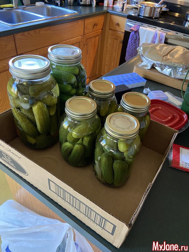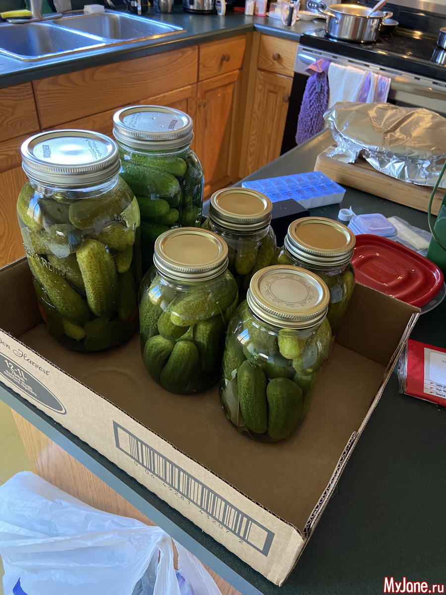 Но зато с утра я занялась консервацией. Вчера на фермерском рынке купила ещё огуров и сегодня закатала ещё 8 литров вкусноты. 2х2л и 4х1л банки.