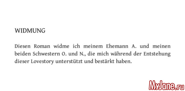 Свой первый роман она посвятила, конечно же, мужу и своим сёстрам О. и Н., которые поддерживали её при создании