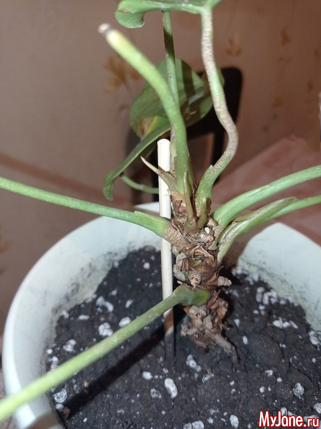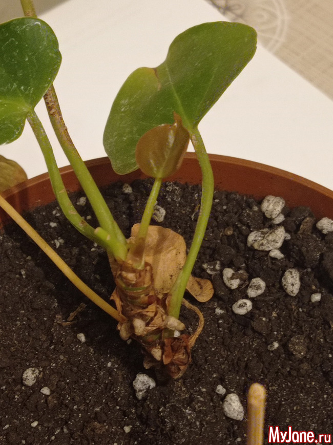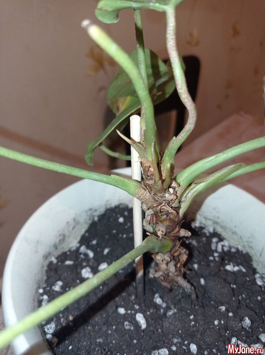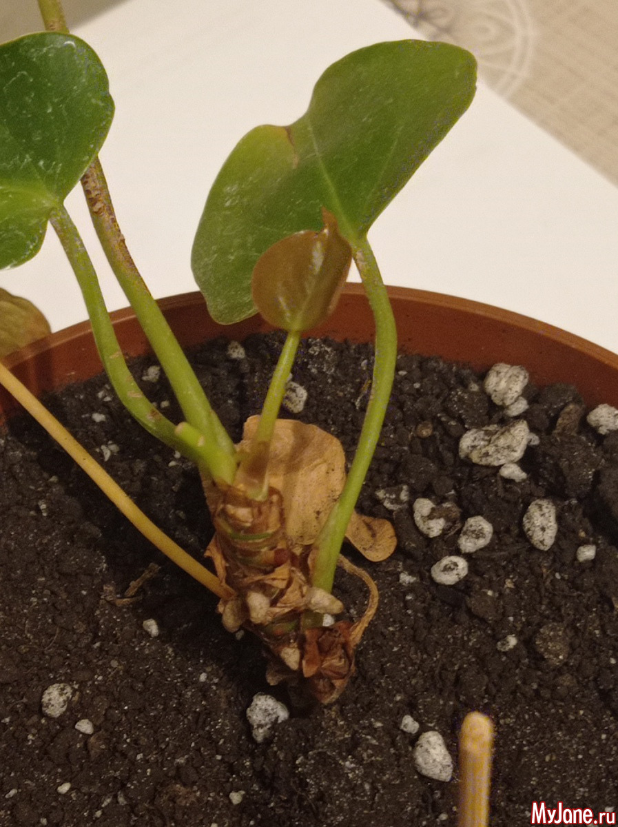 Но вместе с этим появились молодые точки роста. Но развиваться они не торопились. Решила запастись терпением. Поставила на окно без прямых солнечных лучей. Поливала по мере просыхания грунта, опрыскивала каждый день.