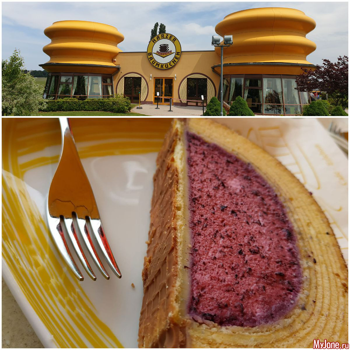 и заглянули в кафешку знаменитой для Гарца кондитерской фабрики Harzer Baumkuchen. Здание напоминает своей формой этот знаменитый пирог (баумкухен – «деревянный пирог»), который является здесь основной продукцией.