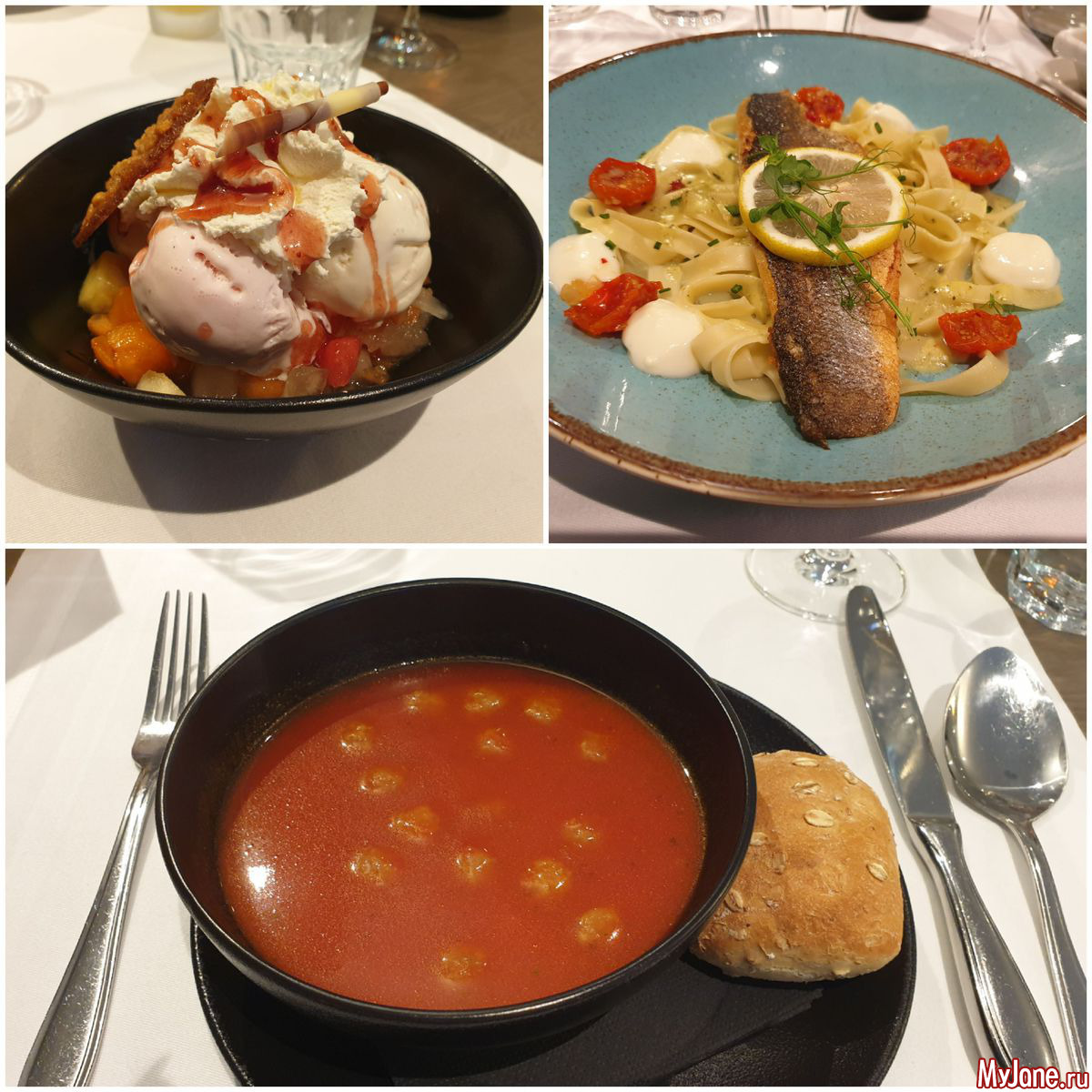 Томатный суп с фрикадельками / Запеченный морской окунь / Фруктовый сорбет