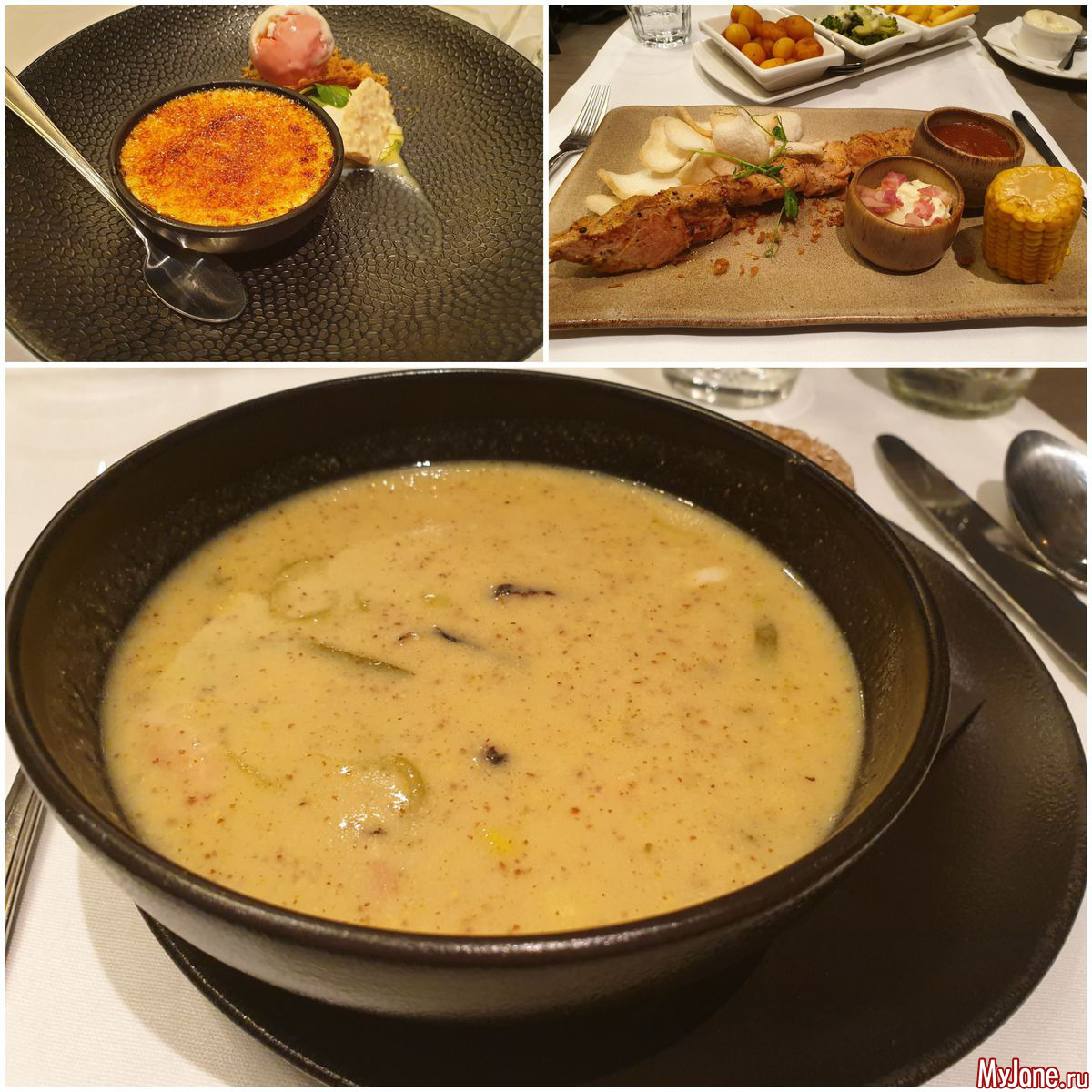 Горчичный суп / Куриный шашлык с арахисовым соусом / Крем-брюле