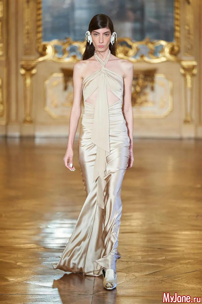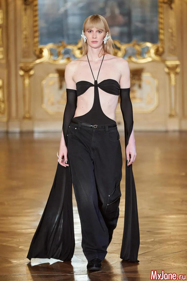 Вторая часть коллекции у дизайнеров получилась в прямом смысле сказочной: перчатки со шлейфом, плетеные топы, брюки с низкой посадкой, украшенные бисерной вышивкой, а также крупные накладки на уши напоминали одеяния эльфов.