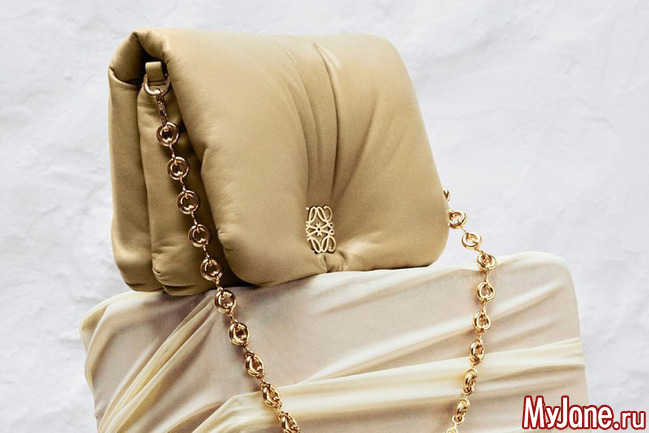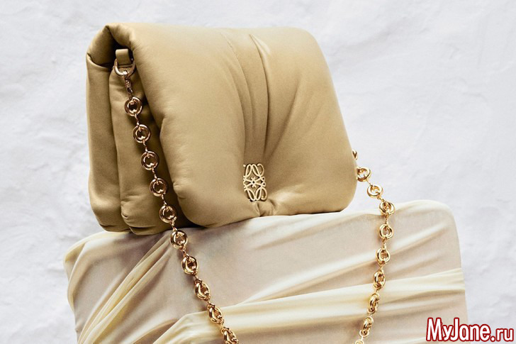 У Loewe есть прекрасная сумка Goya — изящный и лаконичный бокс. К этой осени креативный директор Джонатан Андерсон обновил классическую сумку — теперь ее выпускают в дутой вариации. Аксессуар набит натуральным гусиным пухом — короче говоря, получилась кожаная подушка, которая всегда с тобой.