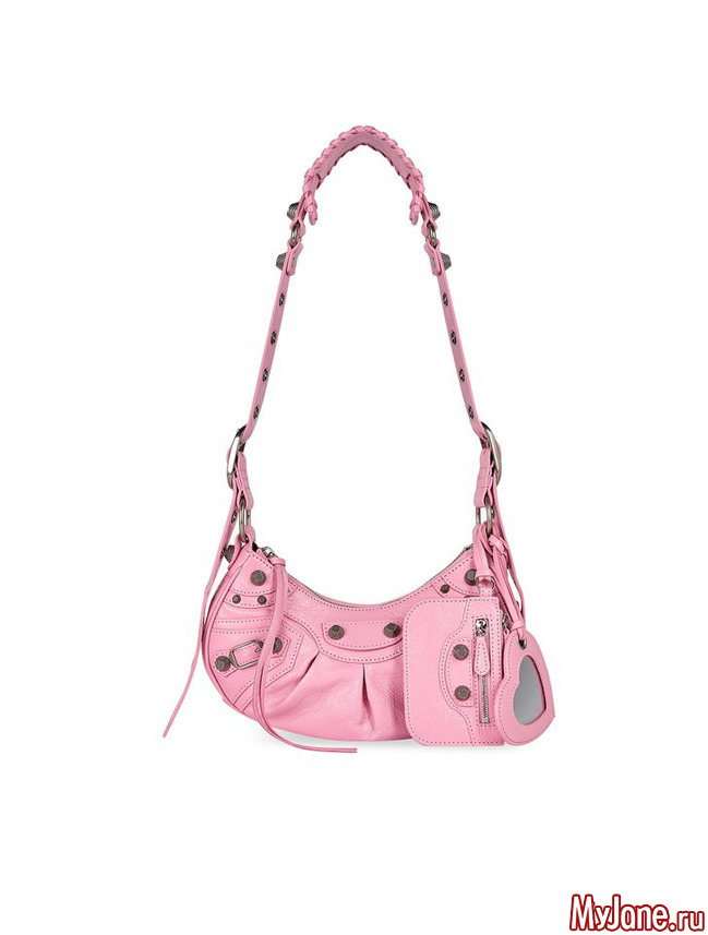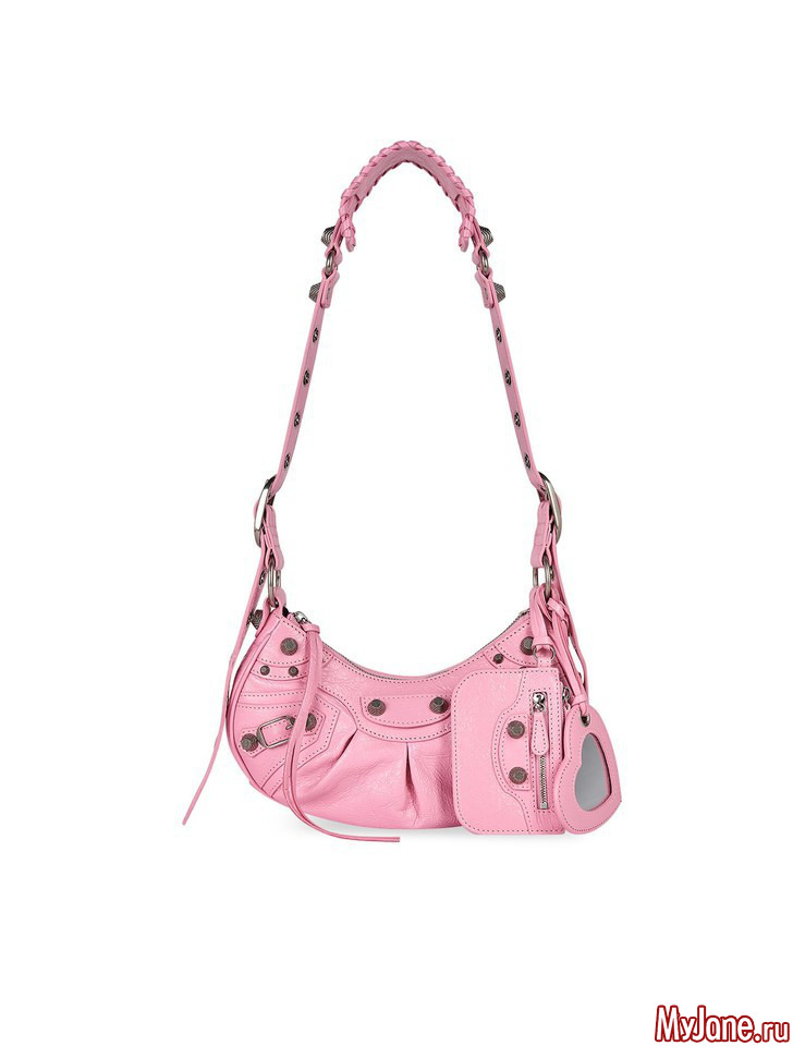 За основу мегахитовой Le Cagole команда Balenciaga взяла старую модель Motorcycle, которую Николя Жескьер придумал для бренда в 2001 году. Архивная сумка превратилась в «багет», но родство все равно легко определить по характерной фурнитуре и ремням. Брутальность «мотоциклетной» сумки смягчает зеркальце в форме сердечка.