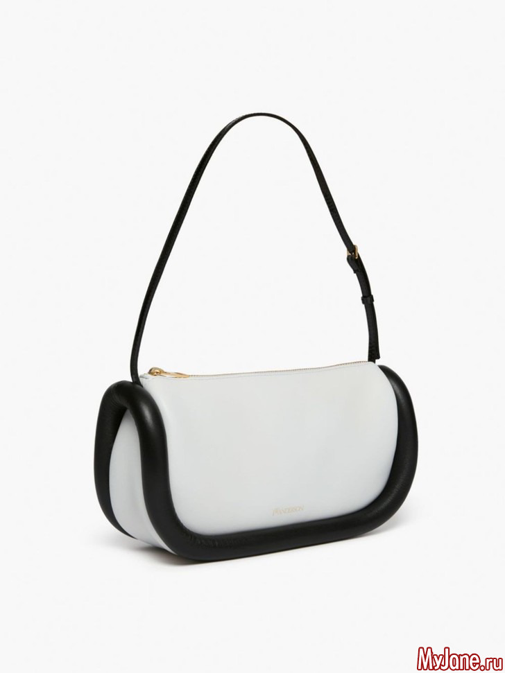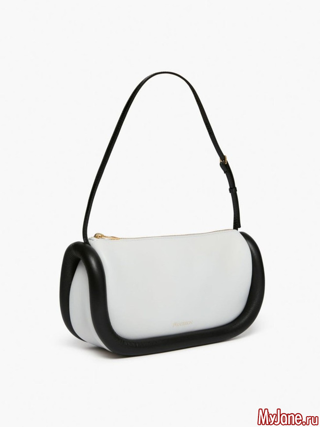 Простейшая форма выглядят свежо благодаря декоративному кожаному «бамперу» по периметру сумки. В новой коллекции JW Anderson есть сумки либо с бампером в тон, либо на контрасте, как этот черно-белый вариант.